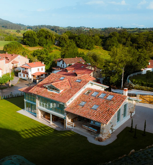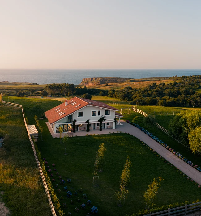 Lujosa villa rodeada de prados verdes, con vistas a los Picos de Europa y al Mar Cantábrico que cuenta con piscina cubierta climatizada.