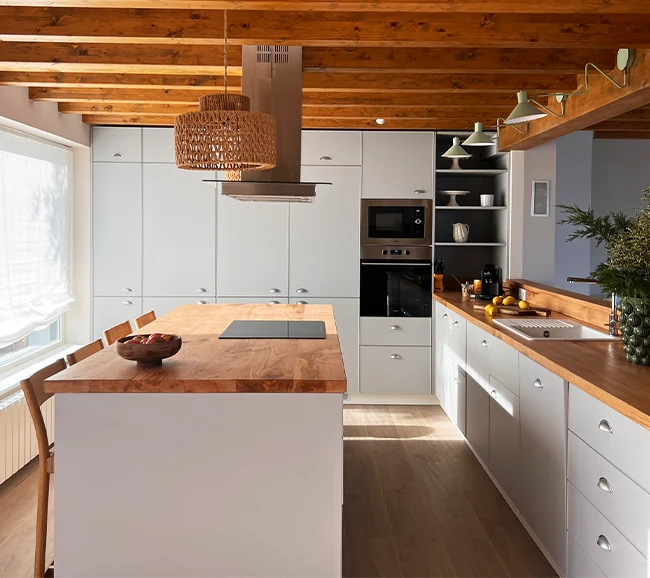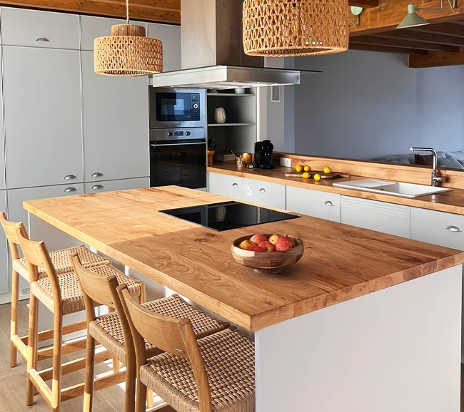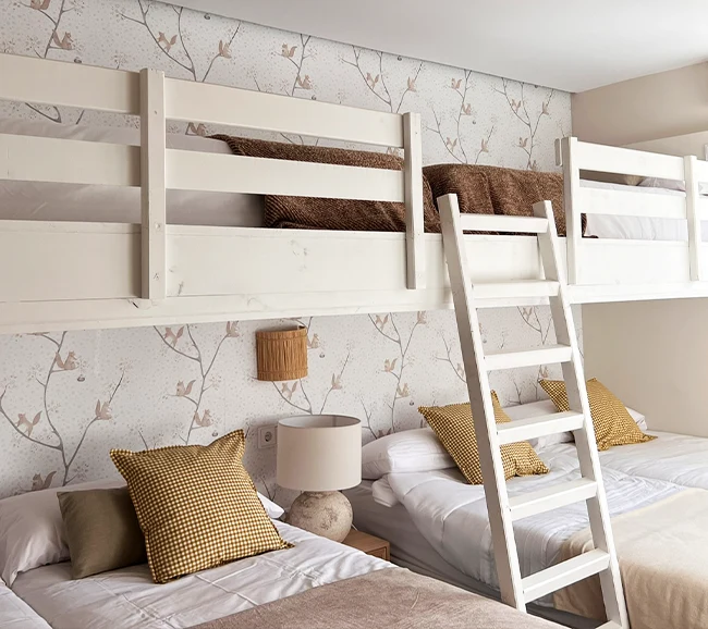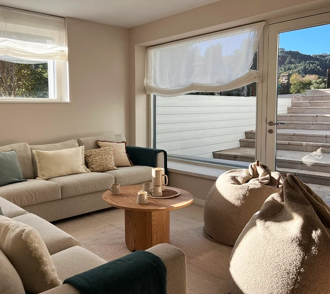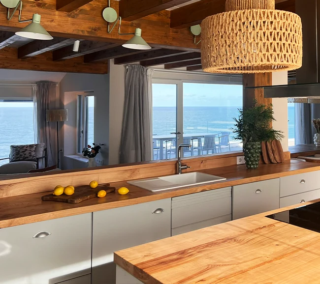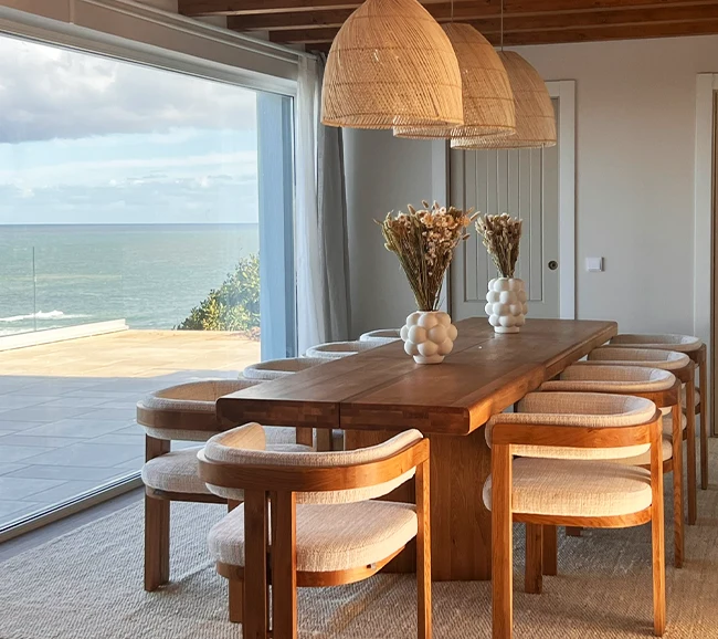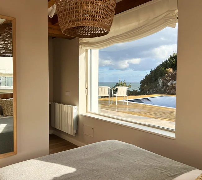 The villa has a dual orientation: to the north, the Cantabrian Sea, visible from most rooms; to the south, the mountains create a lush, green environment that evokes an almost tropical landscape. This duality turns every window into a living painting. El Acantilado can comfortably host 6 guests its Wishome capacity and can be extended to a maximum of 16. What do we mean by Wishome capacity? We created this concept to define the number of guests for whom our home remains truly cozy, regardless of the villa’s maximum capacity. On the entrance floor, you will find an open-plan kitchen connected to the living–dining area, one double bedroom with an en-suite bathroom, and an additional full bathroom with double access from both the dining room and the pool area. On the lower floor, in addition to a lounge area, there are two bedrooms: one double and one with bunk beds, both with en-suite bathrooms. On the second floor, there are three bedrooms with en-suite bathrooms, two with sea views and one overlooking the mountains. The villa also features a private garden, a heated outdoor infinity pool, a large wrap-around terrace with an outdoor dining area and lounge, a living room with a fireplace, and a lookout point over the cliff.