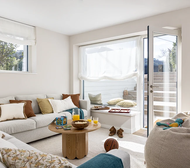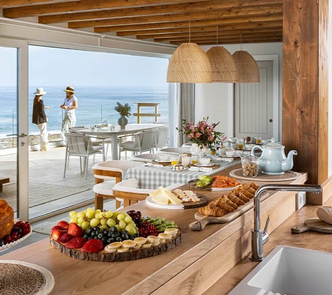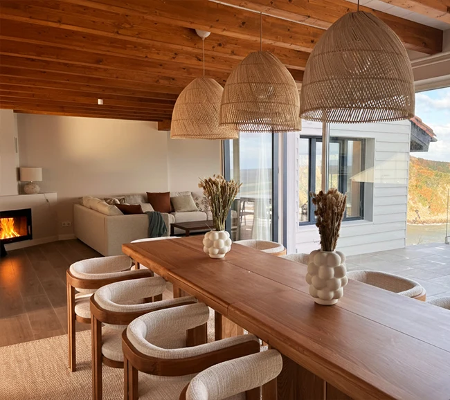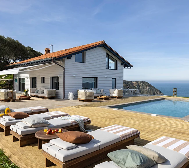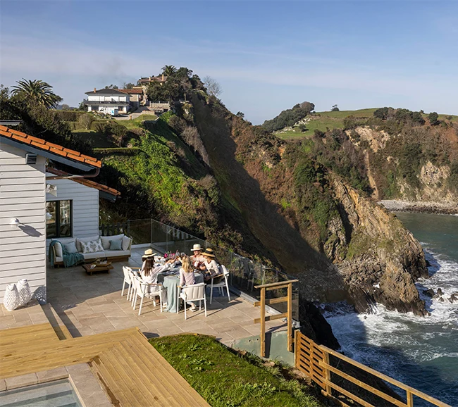 The villa has a dual orientation: to the north, the Cantabrian Sea, visible from most rooms; to the south, the mountains create a lush, green environment that evokes an almost tropical landscape. This duality turns every window into a living painting. El Acantilado can comfortably host 6 guests its Wishome capacity and can be extended to a maximum of 16. What do we mean by Wishome capacity? We created this concept to define the number of guests for whom our home remains truly cozy, regardless of the villa’s maximum capacity. On the entrance floor, you will find an open-plan kitchen connected to the living–dining area, one double bedroom with an en-suite bathroom, and an additional full bathroom with double access from both the dining room and the pool area. On the lower floor, in addition to a lounge area, there are two bedrooms: one double and one with bunk beds, both with en-suite bathrooms. On the second floor, there are three bedrooms with en-suite bathrooms, two with sea views and one overlooking the mountains. The villa also features a private garden, a heated outdoor infinity pool, a large wrap-around terrace with an outdoor dining area and lounge, a living room with a fireplace, and a lookout point over the cliff.