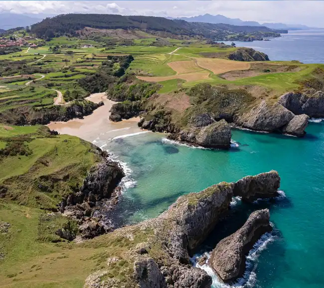 Just a short walk from the villa is Cala Berellín, one of Cantabria’s most prized treasures. It is a small beach surrounded by cliffs with soft white sand, and where the sea water is crystal clear and of an intense turquoise colour, making it an ideal place for swimming, diving or simply enjoying the sun and the sea. As well as being set in idyllic natural surroundings the villa is also located close to some of the area’s most outstanding places of interest. Just a few minutes drive away is the charming town of San Vicente de la Barquera, with its impressive old town centre and famous medieval bridge.