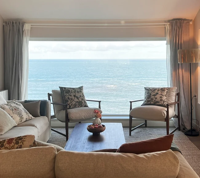 La villa bénéficie d’une double orientation : au nord, la mer Cantabrique, visible depuis la plupart des pièces ; au sud, la montagne crée un environnement vert et luxuriant évoquant un paysage presque tropical. Cette dualité transforme chaque fenêtre en un tableau vivant.
