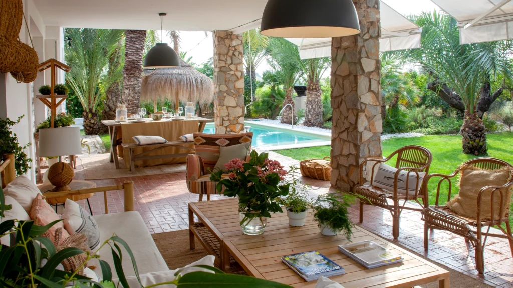 En la reforma de esta casa se ha conservado parte de su espíritu tradicional, habiéndose preservado parte de los suelos, un patio interior o su cocina. El porche, que ofrece una vista magnifica hacia el jardín y la piscina, es perfecto para refugiarse del calor y relajarse en mitad de un vergel.